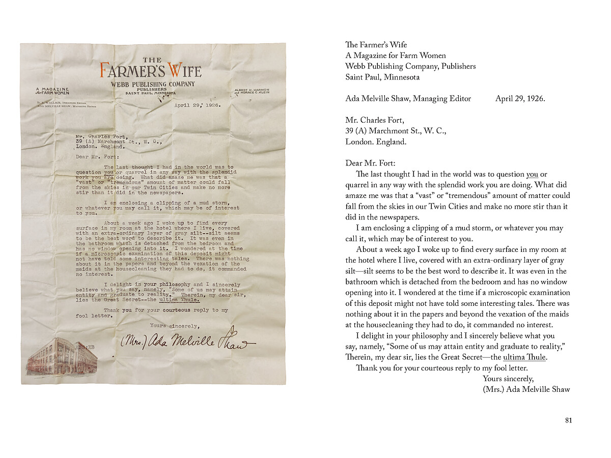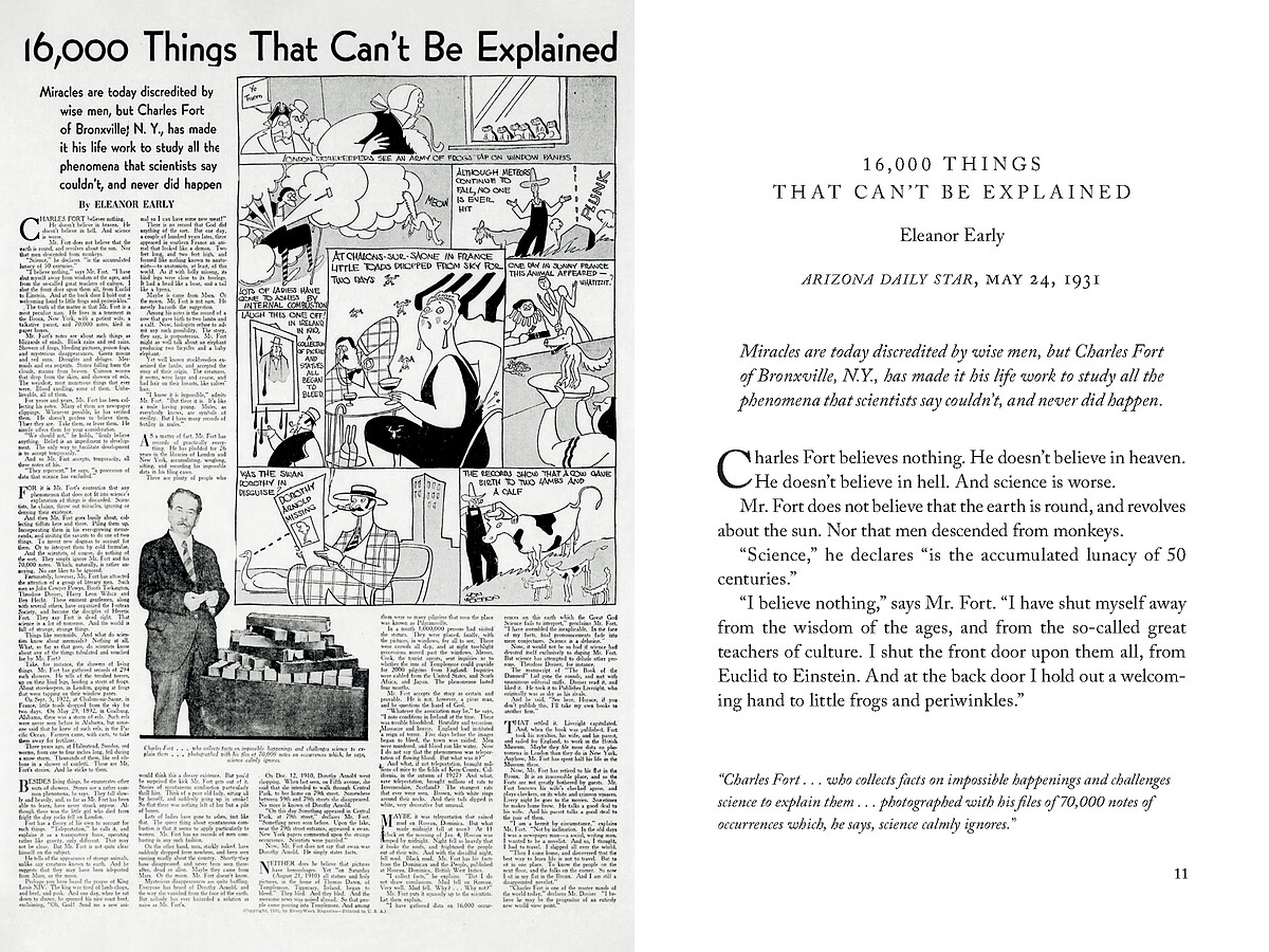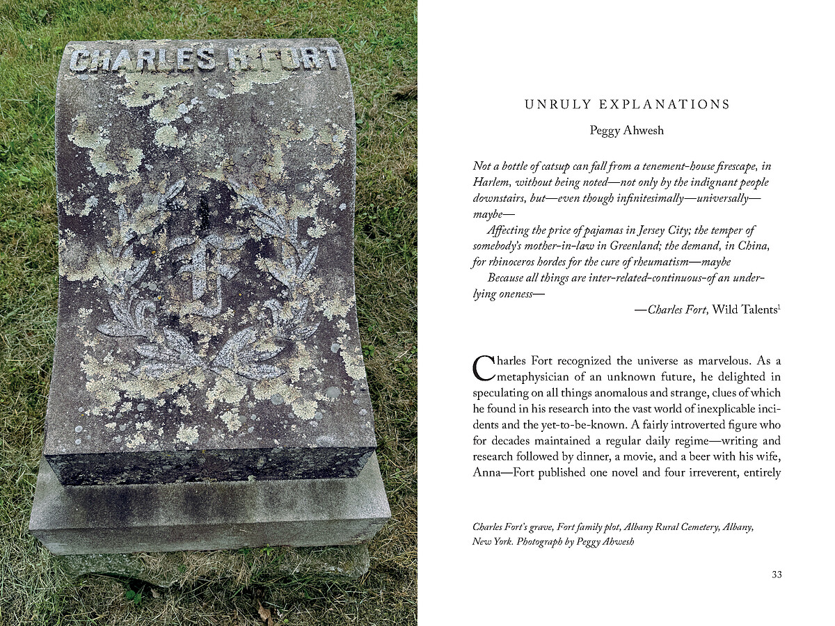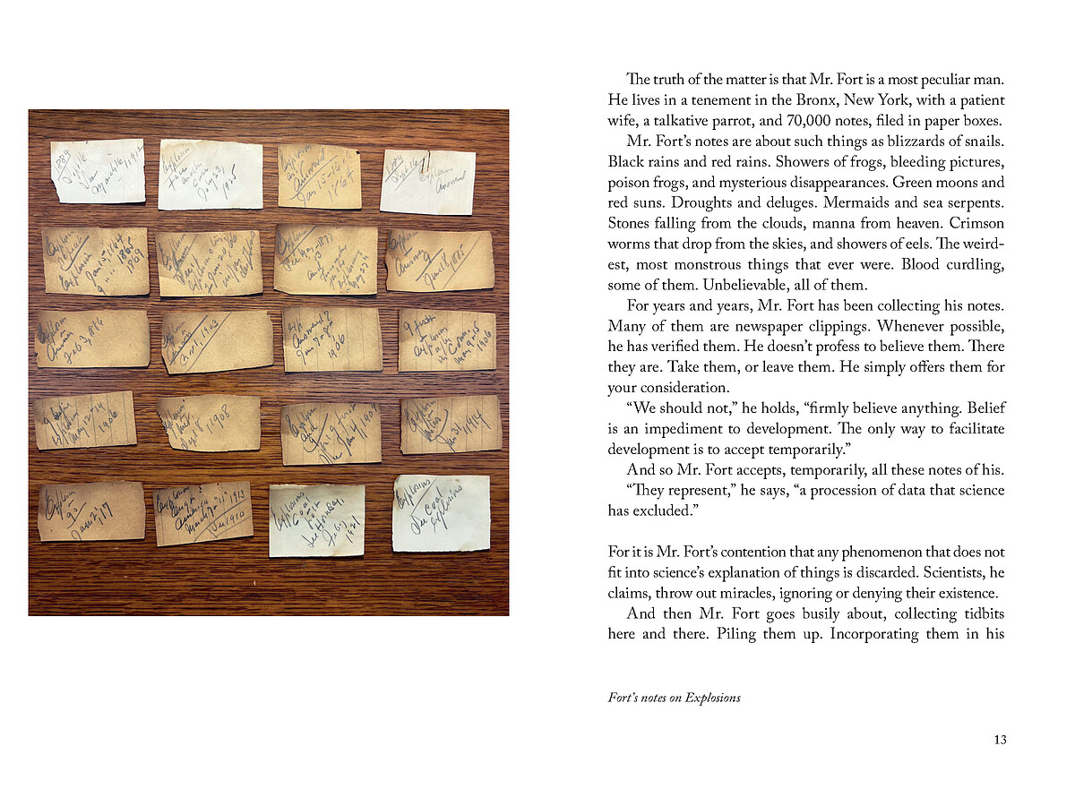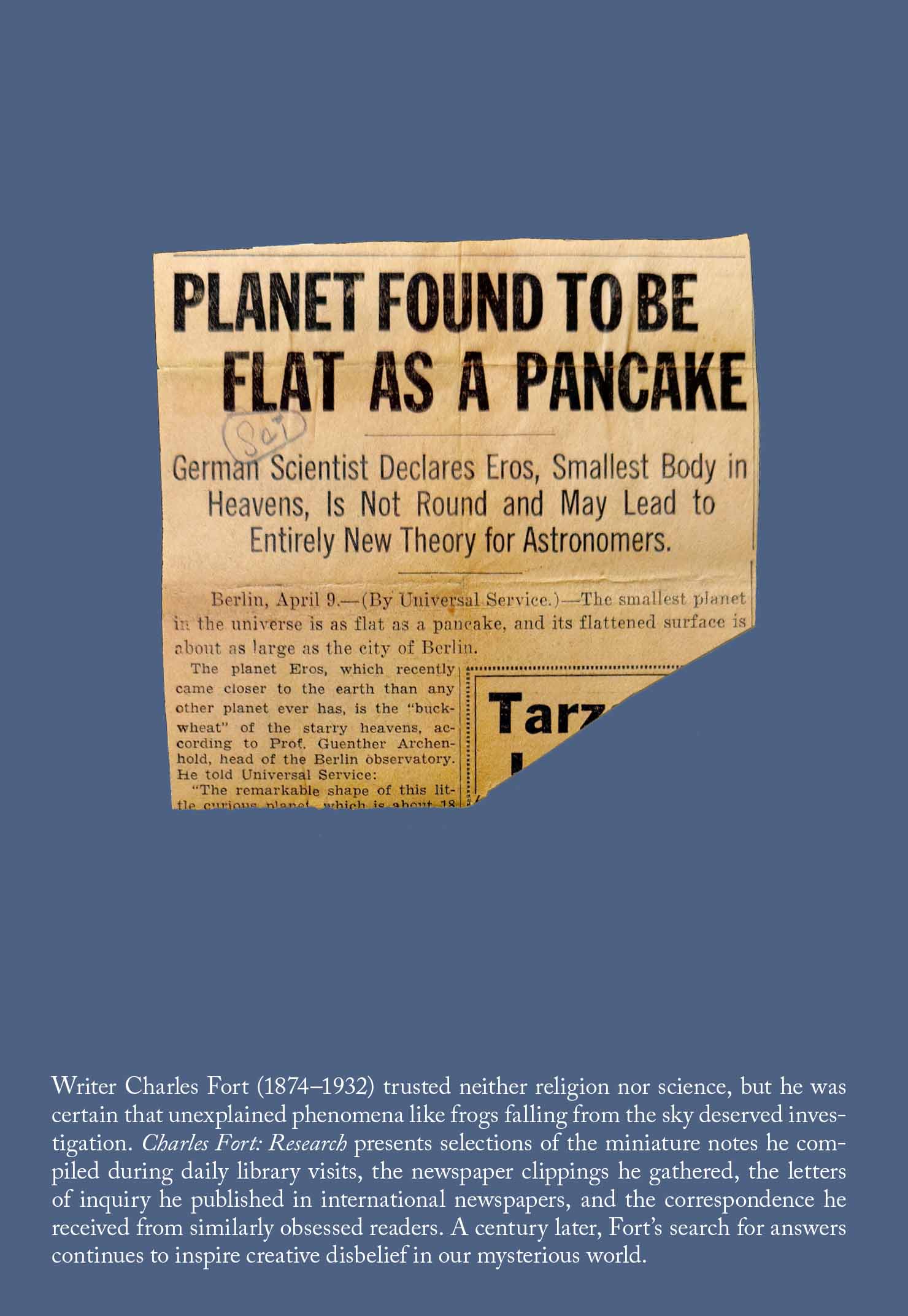 Writer Charles Fort (1874–1932) trusted neither religion nor science, but he was certain that unexplained phenomena like frogs falling from the sky deserved investigation. Charles Fort: Research presents selections of the miniature notes he compiled during daily library visits, the newspaper clippings he gathered, the letters of inquiry he published in international newspapers, and the correspondence he received from similarly obsessed readers. Also included is an appreciation by acclaimed filmmaker and self-proclaimed Fortean Peggy Ahwesh. A century later, Fort’s search for answers continues to inspire creative disbelief in our mysterious world.