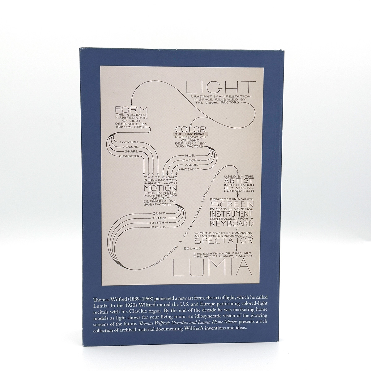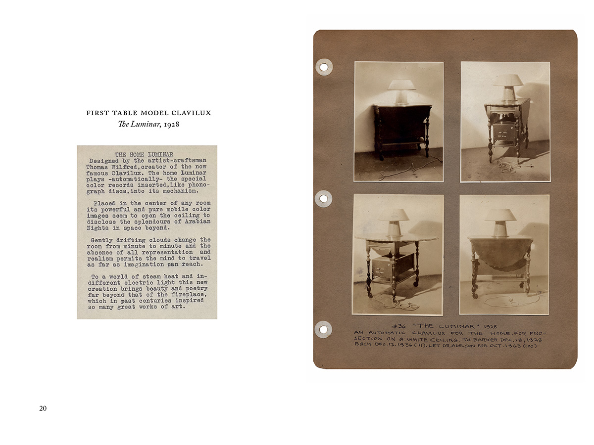 Thomas Wilfred (1889–1968) devoted his life to the creation of a new art form, the art of light, which he termed "Lumia." In the 1920s, Wilfred toured the US and Europe to great acclaim staging colored-light recitals with his Clavilux organ. By the late '20s he had reinvented these large scale performances as self-enclosed light shows for living room entertainment. Wilfred’s aesthetically elegant and interactive Clavilux and Lumia home models were soon found in the collections of important art world figures and in major museums. His work was on view into the '80s at MoMA, where it was seen by many of the artists who came to work with light as their medium in the '60s and '70s. Thomas Wilfred: Clavilux and Lumia Home Models presents a fascinating collection of archival material culled from the Wilfred archive at Yale University and other sources, including never before published sketches by Wilfred and documentation of these strange glowing screens that predated television, video art, and psychedelia.