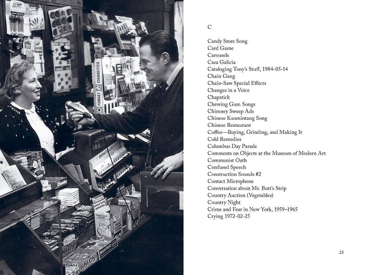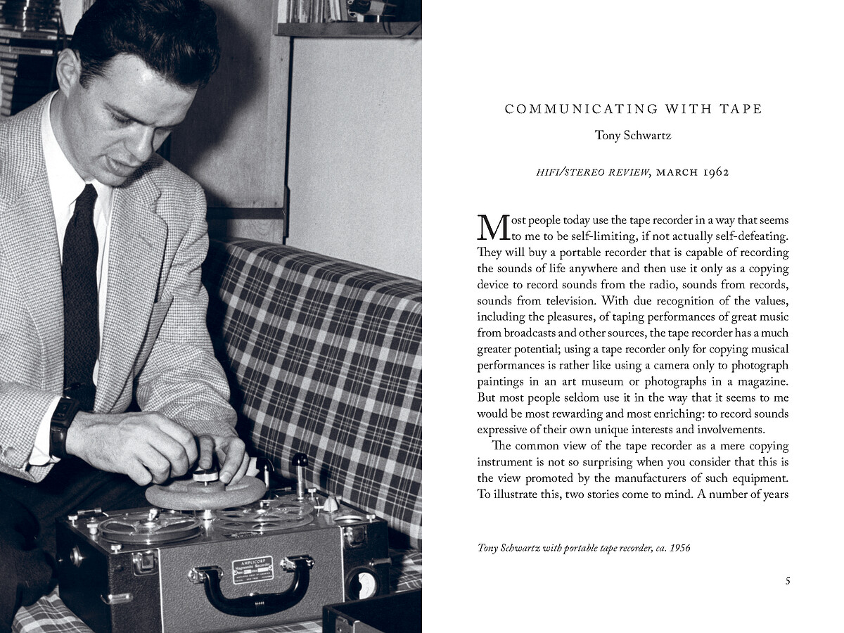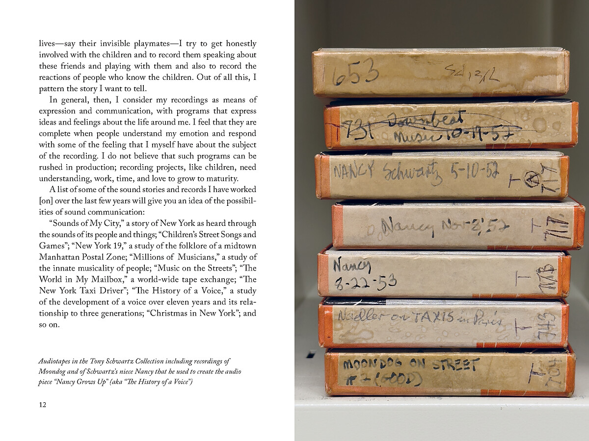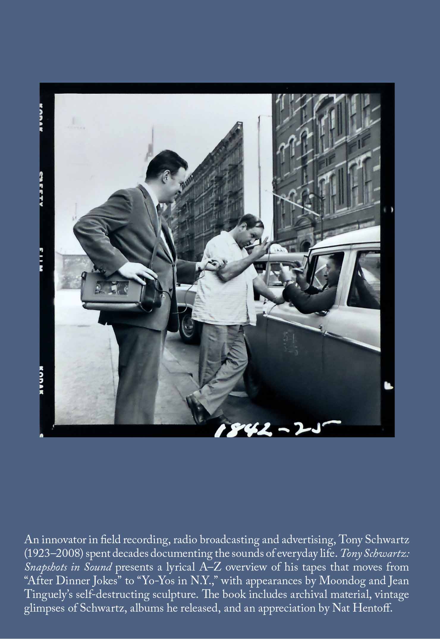An innovator in field recording, radio broadcasting and advertising, Tony Schwartz (1923–2008) spent decades documenting the sounds of everyday life. Tony Schwartz: Snapshots in Sound presents a lyrical A–Z overview of his tapes that moves from “After Dinner Jokes” to “Yo-Yos in N.Y.,” with appearances by Moondog and Jean Tinguely’s self-destructing sculpture. The book includes archival material, vintage glimpses of Schwartz, albums he released, and an appreciation by Nat Hentoff.